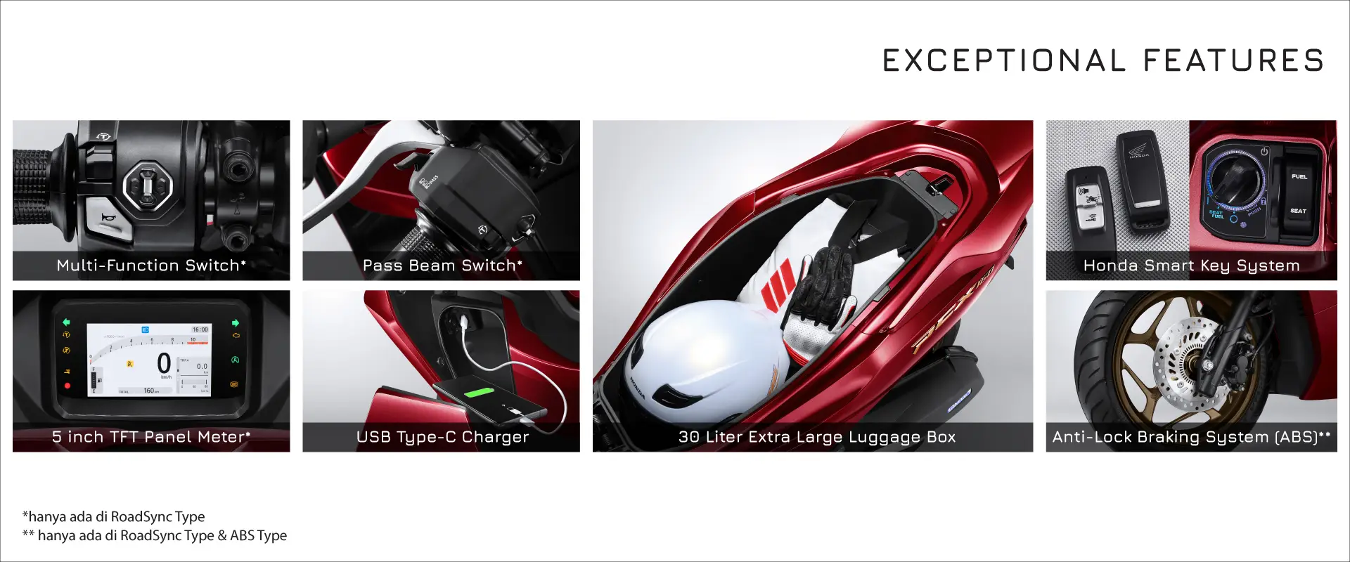 | Tipe Suspensi Belakang | (Tipe CBS & ABS) Suspensi Belakang Ganda / (Tipe RoadSync) Suspensi Belakang Ganda dengan Tabung |